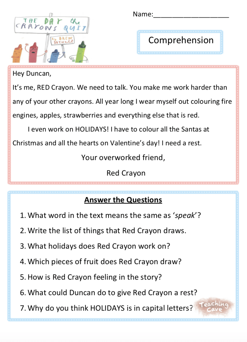 What crayon appears first in the story? This activity linked to the popular book the day the crayons quit is aimed at ks1 classes and helps your children develop their comprehension skills. The day the crayons quit essential questions 2.